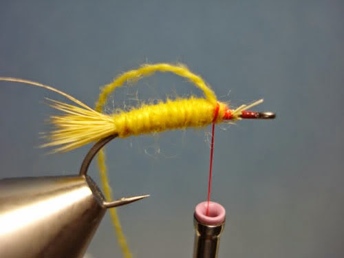 Rib: Undersized ginger hackle, counter-ribbed with fine gold wire